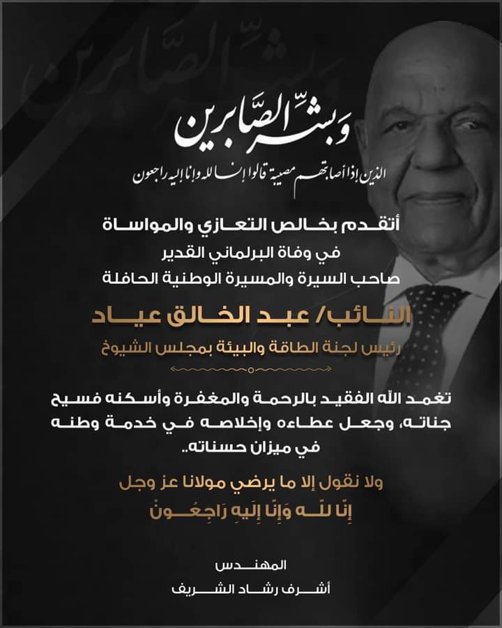 نعي النائب البرلماني أشرف رشاد الشريف ” الأمين العام لحزب مستقبل وطن ” النائب عبدالخالق عياد رئيس لجنة الطاقة والبيئة والقوي العاملة بمجلس الشيوخ ” الذي رحل عن عالمنا في الساعات الأولى من صباح اليوم الجمعة ” قائلا في نعيه”أتقدم بعظيم التعازي المواساة في وفاة البرلماني القدير صاحب السيرة والمسيرة الوطنية الحافلة النائب عبدالخالق عياد رئيس لجنة الطاقة والبيئة والقوي العاملة بمجلس الشيوخ