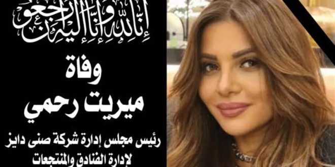 أعلنت أسرة ميريت رحمي رئيس مجلس إدارة شركة صني دايز لإدارة الفنادق والمنتجعات عن تلقي واجب العزاء في وفاة فقيدتهم الاثنين المقبل بالقاعة الرئيسية لمسجد الشرطة بالشيخ زايد عقب صلاة المغرب