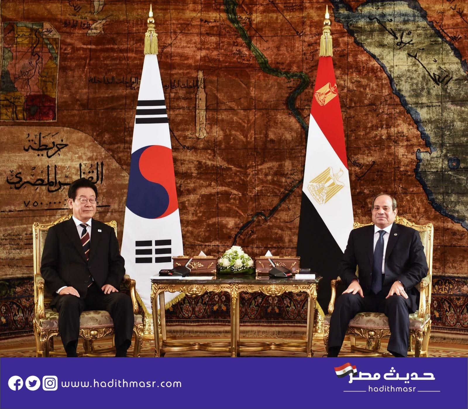 وأشار السفير محمد الشناوي، المتحدث الرسمي، إلى أن السيد الرئيس استهلّ اللقاء بالترحيب بضيف مصر الكريم في زيارته الأولى لمصر منذ توليه منصبه في يونيو 2025، التي تتزامن مع احتفال البلدين بمرور ثلاثين عامًا على إقامة العلاقات الدبلوماسية بينهما. وأكد السيد الرئيس أهمية مواصلة تعزيز العلاقات الثنائية المتميزة في كافة المجالات وبالأخص المجالات الاقتصادية والاستثمارية والثقافية، وكذا في مجال التعليم، مشيدًا بالتجربة التنموية الكورية، ومعربًا عن تطلع مصر لزيادة حجم أعمال الشركات الكورية واستثماراتها في مختلف القطاعات ذات الأولوية، خاصة الاتصالات وتكنولوجيا المعلومات، وصناعة السيارات، وبناء السفن، والذكاء الاصطناعي، والبتروكيماويات والتعدين، مع التركيز على توطين هذه الصناعات داخل مصر. كما أبرز السيد الرئيس ما تقدمه الدولة المصرية من ضمانات وحوافز استثمارية ومزايا تنافسية للسوق المصرية