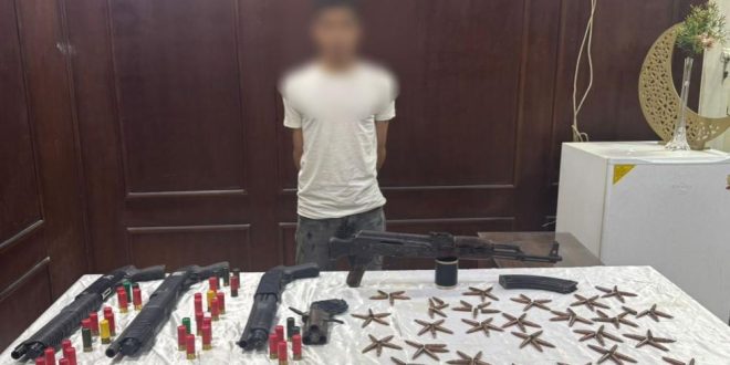 عقب تقنين الإجراءات تم ضبطه، وبحوزته (3 بنادق خرطوش، بندقية آلية، فرد خرطوش، عدد من الطلقات النارية مختلفة الأعيرة).