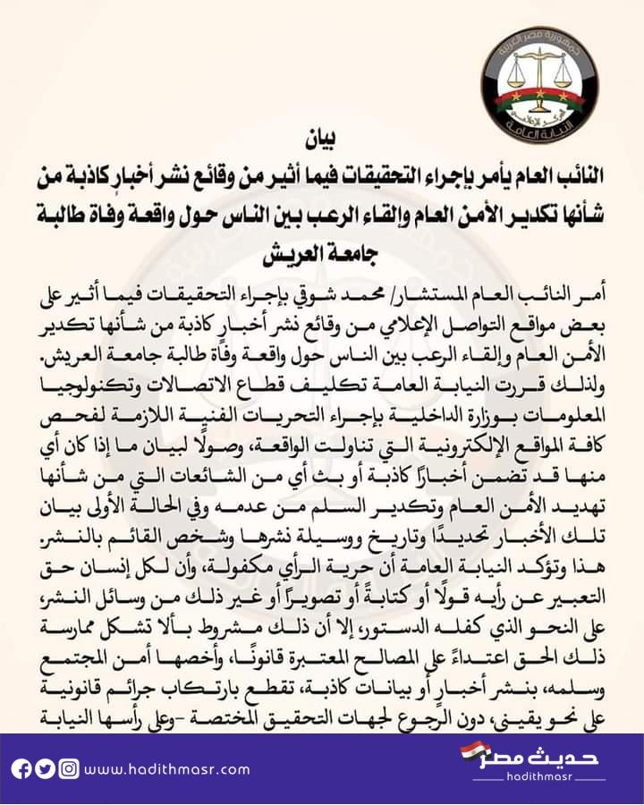 أصدر المستشار محمد شوقي النائب العام ” قبل قليل اليوم الاثنين بإجراء التحقيقات فيما أثير على بعض مواقع التواصل الإعلامي من وقائع نشر أخبار كاذبة من شأنها تكدير الأمن العام وإلقاء الرعب بين الناس حول واقعة وفاة طالبة جامعة العريش.