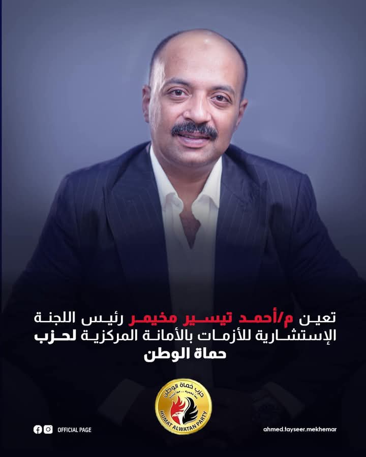 أعلن حزب حماة الوطن اليوم الخميس تعيين المهندس | أحمد تيسير رئيسا للجنة الاستشارية للأزمات بالأمانة المركزية بحزب حماة الوطن