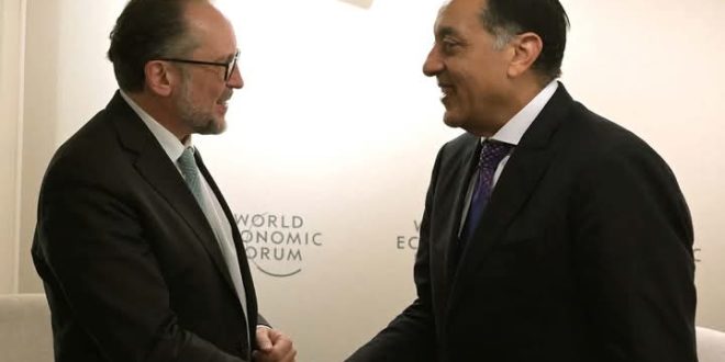 خلال مشاركته في فعاليات اليوم الثالث للمنتدى الاقتصادي العالمي، دافوس 2025، بسويسرا، نيابة عن فخامة الرئيس عبد الفتاح السيسي، رئيس الجمهورية، التقى الدكتور مصطفى مدبولي، رئيس مجلس الوزراء، السيد/ ألكسندر شالينبرج، مستشار جمهورية النمسا، وزير الخارجية، وذلك بحضور السفير/ محمد نجم، سفير مصر في سويسرا.