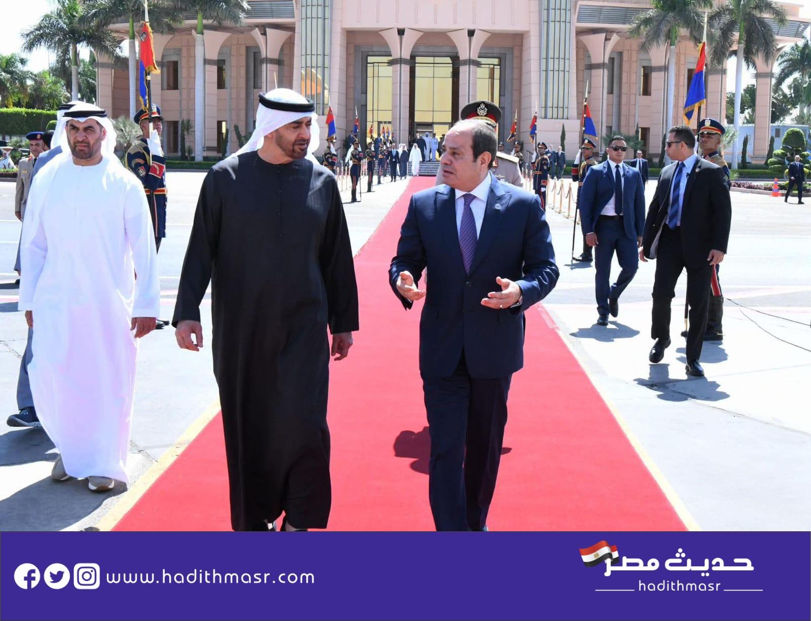 وصرّح المتحدث الرسمي باسم رئاسة الجمهورية بأن اللقاء شمل اجتماعاً موسعاً ضم وفدي البلدين، أعقبه اجتماع ثنائي مغلق بين الزعيمين، ثم مأدبة غداء عمل أقيمت تكريماً لضيف مصر الكبير والوفد المرافق لسموه. وقد استهل السيد الرئيس اللقاء بالتأكيد على عمق ومتانة العلاقات الثنائية بين مصر ودولة الإمارات، مشيداً بالتطور الملحوظ في التعاون بين البلدين في مختلف المجالات، لا سيما في مجالي التجارة والاستثمار. كما أعرب سيادته عن حرص الدولة المصرية على تذليل كافة العقبات أمام الاستثمارات الإماراتية، مثمناً الطفرة التي تشهدها العلاقات الاقتصادية بين الجانبين. من جانبه، أشاد صاحب السمو الشيخ محمد بن زايد آل نهيان بما يشهده مناخ الاستثمار في مصر من تطور كبير، يعكس الجهود المبذولة لتعزيز بيئة الأعمال وجذب الاستثمارات