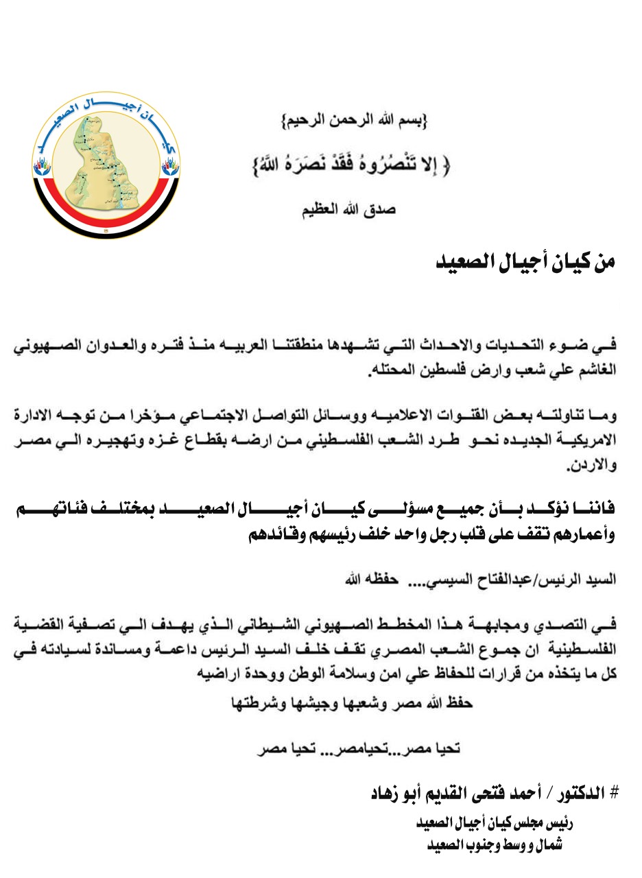 أصدر اليوم الأربعاء الدكتور | أحمد فتحي القديم رئيس مجلس أمناء كيان أجيال الصعيد يصدر بيانا صحفيا هاما لدعمه القضية الفلسطينية