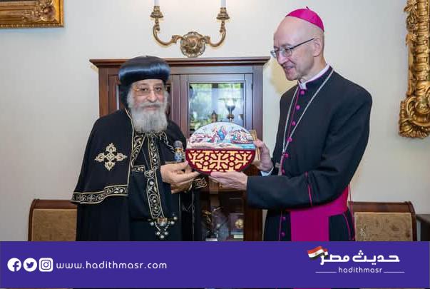 ومن جهته عبر قداسة البابا عن شكره على حفاوة الاستقبال، وتحدث عن أهمية تبادل الخبرات بين الكنائس مما يسهم في التقارب بينها، جنبًا إلى جنب مع الحوار اللاهوتي. ثم قدم لمحة عن تاريخ الكنيسة القبطية الأرثوذكسية ونشأتها على يد القديس مرقس الرسول عام ٦٨ ميلاديًا وأنها كنيسة مبنية على الحب الحقيقي بين الراعي والرعية، بين الأسقف والكاهن والشعب، ولذلك من تقاليدنا أن يعيش الكاهن وسط شعبه، غير منفصل عنهم، قريبًا من أحزانهم وأفراحهم، يسمع نبض حياتهم، ويكون صورة حية للمسيح الراعي
