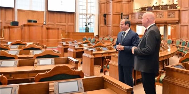 الرئيس عبد الفتاح السيسي- خلال تفقده مبني البرلمان الدنماركي يرافقه رئيسه الدنماركي
