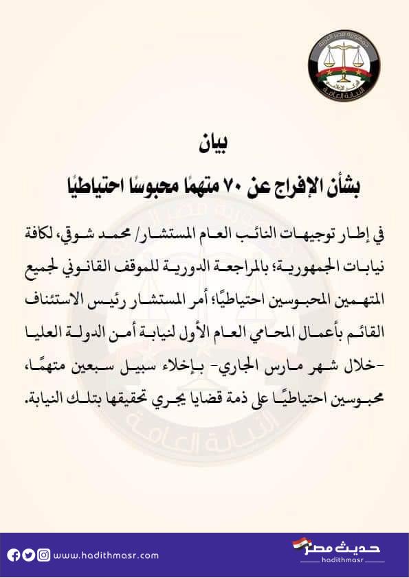 عاجل النائب العام يأمر ” بإخلاء سبيل 70 متهمًا من المحبوسين احتياطيًا على ذمة قضايا نيابة أمن الدولة
