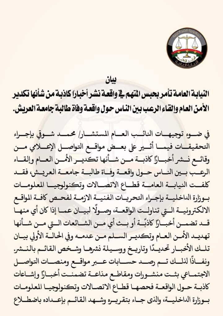 وجاء قرار النيابة العامة تنفيذا لتوجيهات النائب العام المستشار محمد شوقي، بإجراء التحقيقات فيما أثير ببعض مواقع التواصل الإعلامي، من وقائع نشر أخبارًا كاذبة تعمل على تكدير الأمن العام وإثارة الذعر، في النفوس بشأن واقعة وفاة طالبة جامعة العريش.