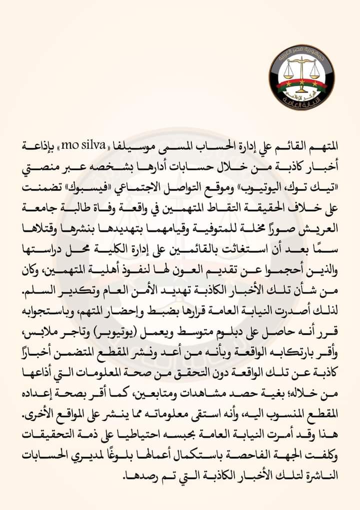 أصدر النائب العام المستشار محمد شوقي “قرارا بحبس يوتيوبر يدير حسابا باسم «موسيلفا mo silva»، لقيامه بإذاعة أخبارا كاذبة بشأن واقعة وفاة نيرة طالبة العريش.