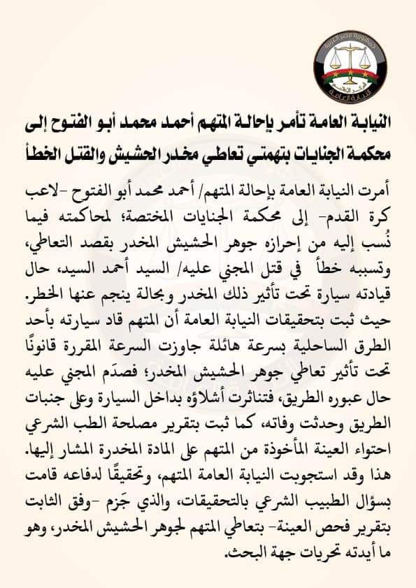 وكانت النيابة العامة أمرت بإحالة المتهم أحمد محمد أبو الفتوح -لاعب نادي الزمالك إلى محكمة الجنايات المختصة، لمحاكمته فيما نُسب إليه من إحرازه جوهر الحشيش المخدر بقصد التعاطي، وتسببه خطأ في قتل المجني عليه السيد أحمد السيد، حال قيادته سيارة تحت تأثير ذلك المخدر وبحالة ينجم عنها الخطر