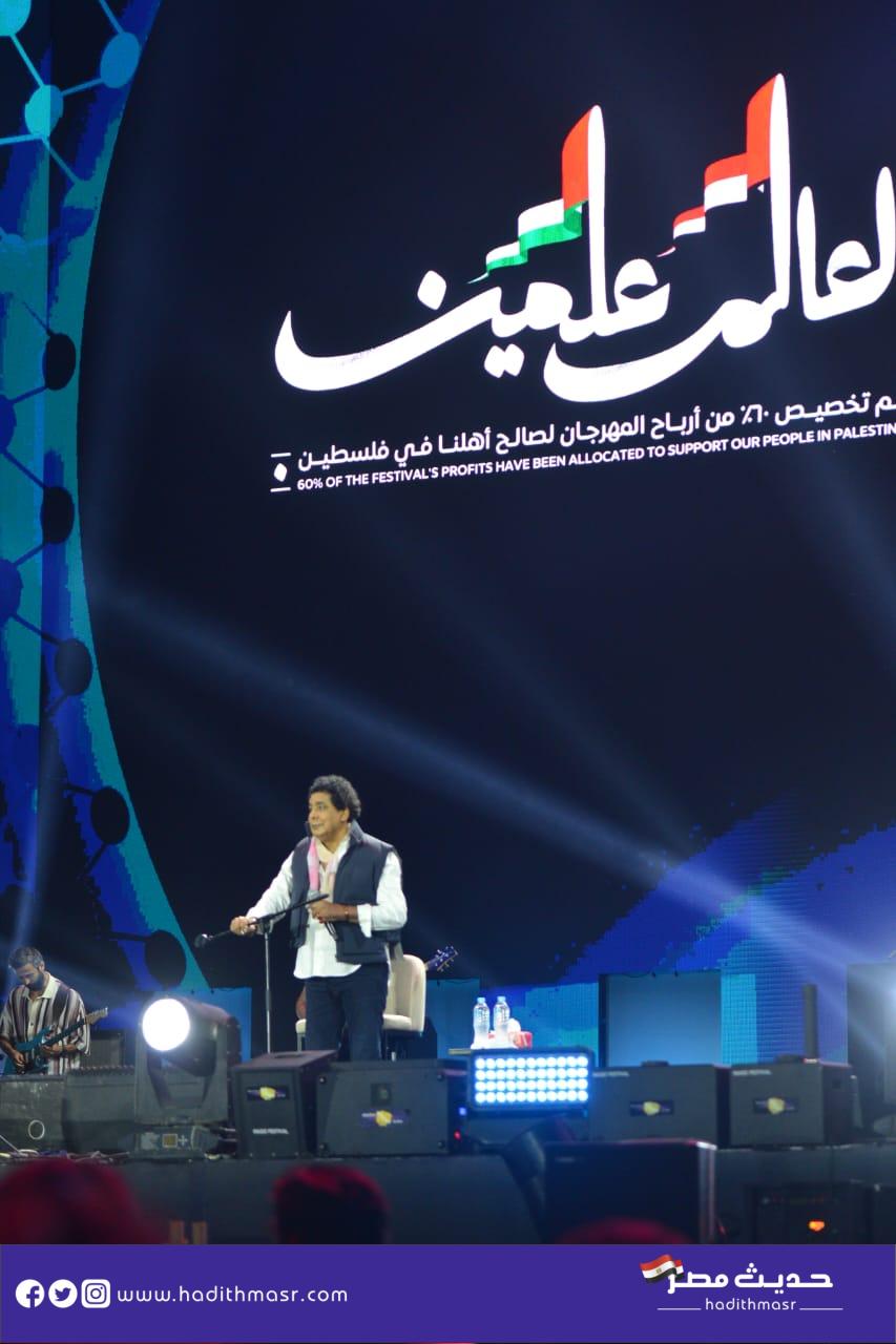 شهدت أولى الحفلات الفنية بمهرجان العلمين في دورته الثانية، تقديم رسالة حب وتضامن مع فلسطين بصوت الكينج محمد منير، على مسرح U ARENA، الذي زينه علم فلسطين قبل صعود الكينج